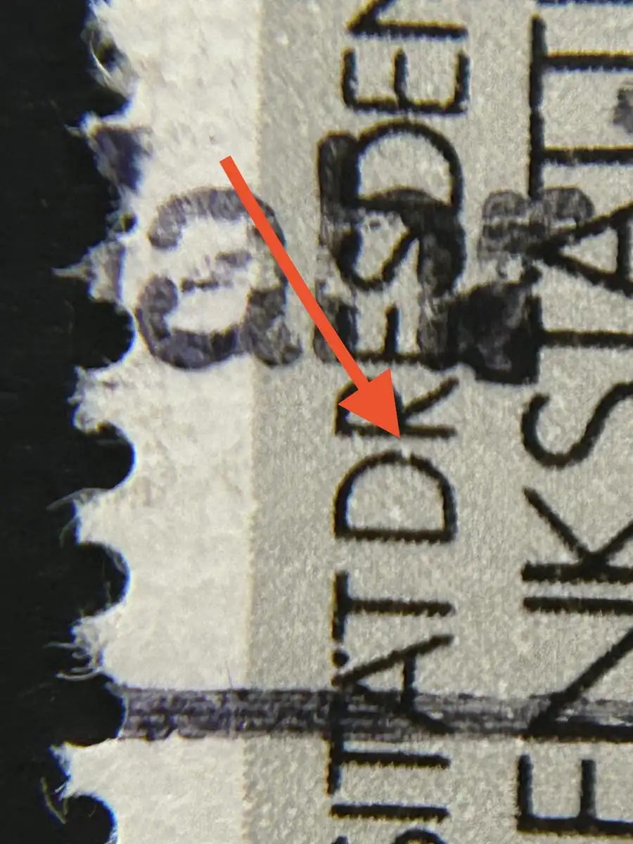 Plattenfehler: Bruch im Bogen des ersten "D" von "DRESDEN", BF 5.