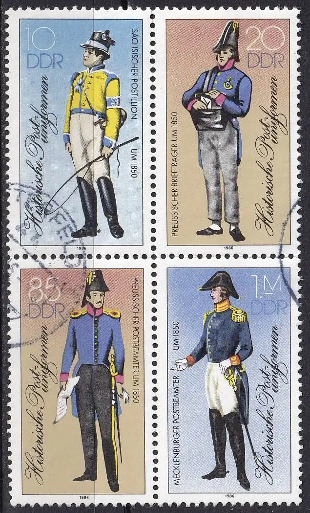 Historische Postuniformen: Sächsischer Postillion (um 1850) / Preußischer Briefträger (um 1850) / Preußischer Postbeamter (um 1850) / Mecklenburger Postbeamter (um 1850)