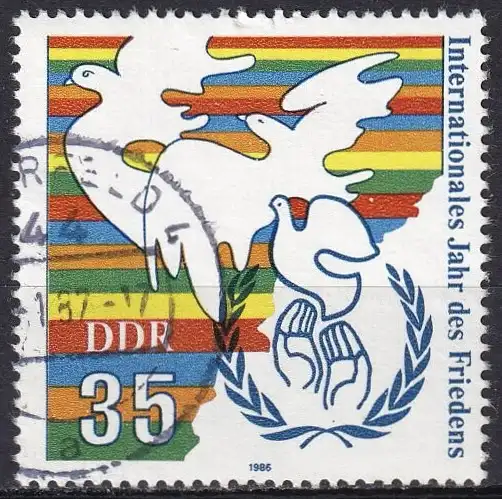Internationales Jahr des Friedens: Friedenstauben, UNO-Emblem, Hände