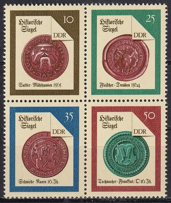 Historische Siegel (II): Siegel der Sattler von Mühlhausen (1565) / Siegel der Fleischer von Dresden (1564) / Siegel der Schmiede von Nauen (16. Jh.) / Siegel der Tuchmacher von Frankfurt (Oder) (16. Jh.)