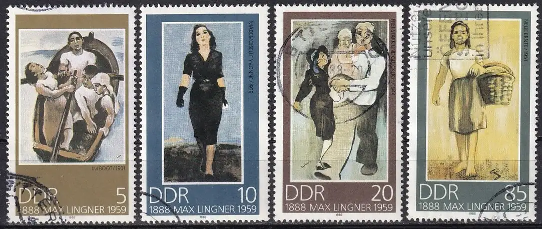 100. Geburtstag von Max Lingner:Gemälde von M. Lingner (1888-1959), Maler und Pressezeichner: Im Boot / Mademoiselle Yvonne / Frei, stark und glücklich / Neue Ernte