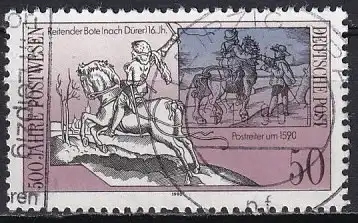 500 Jahre internationale Postverbindungen in Europa (II): Der kleine Postreiter, Stich von A. Dürer (16. Jh.), Postreiter (um 1590)