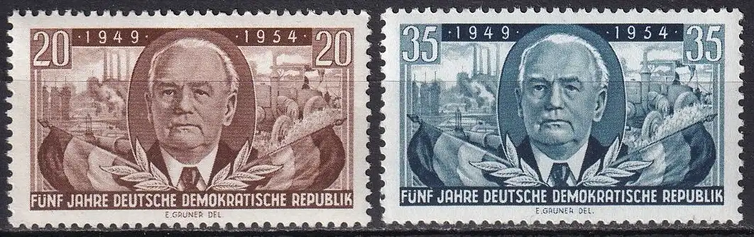 5 Jahre Deutsche Demokratische Republik: Wilhelm Pieck (1876-1960), erster Präsident der DDR; Fahnen, Benzinwerk Böhlen und Traktor