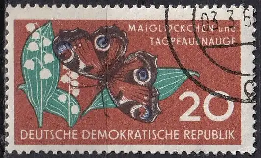Naturschutz: Tagpfauenauge (Vanessa io) und Maiglöckchen (Convallaria majalis)