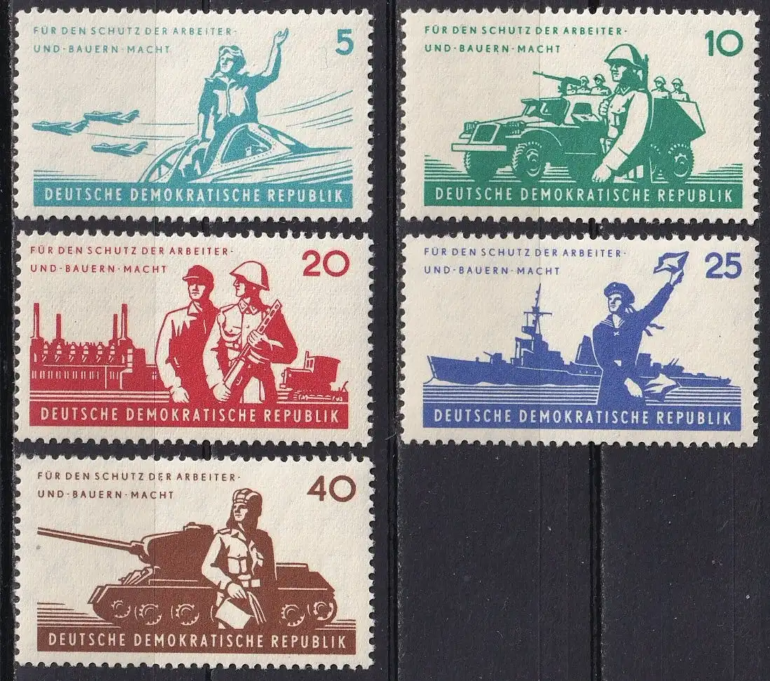 6 Jahre Nationale Volksarmee (NVA): Pilot in der Kanzel, Jagdflugzeuge der Luftstreitkräfte / Soldat, Schützenpanzerwagen der Landstreitkräfte / Soldat und Arbeiter, Industriebetrieb, Traktor / Signalgast, Küstenschutzschiff der Marine / Soldat, Panzer