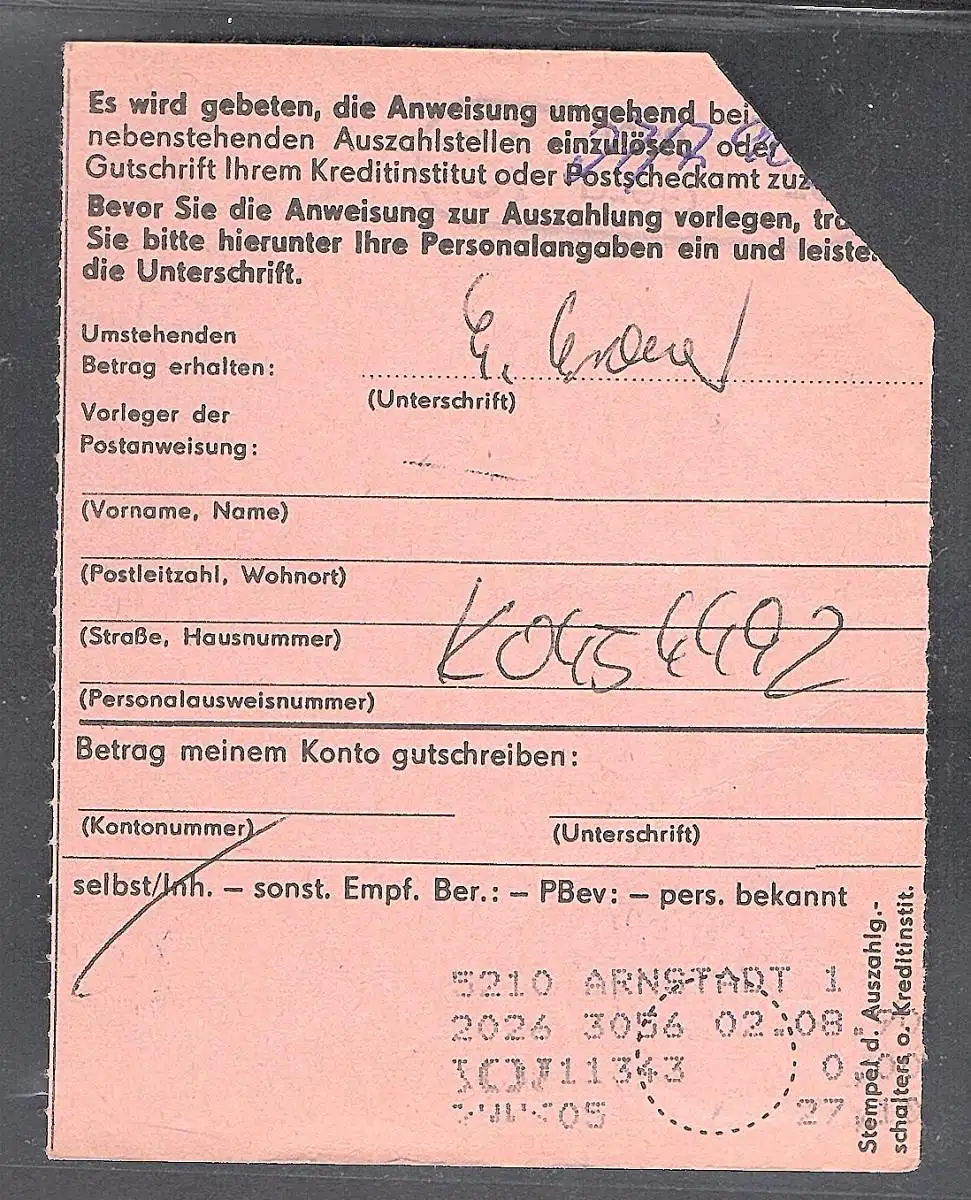 DDR. Postanweisung mit EF. Mi.-Nr. 3351 VGO-Tarif.