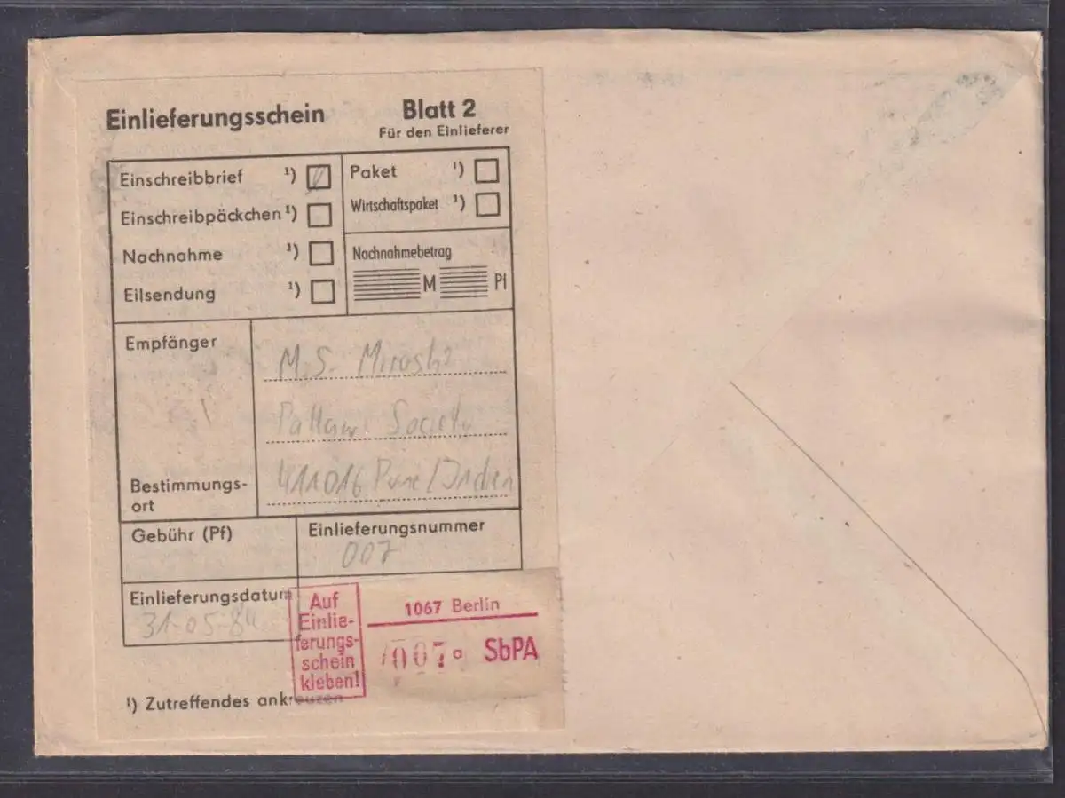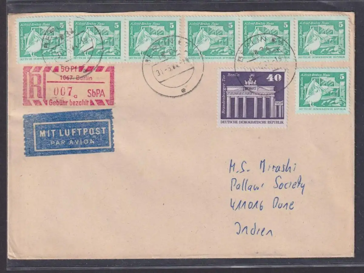 DDR R Brief Einschreibzettel 50 Pfg. Berlin ZuF 2 3er Streifen Aufbau n. Indien