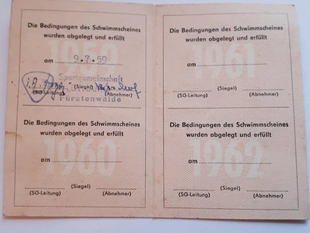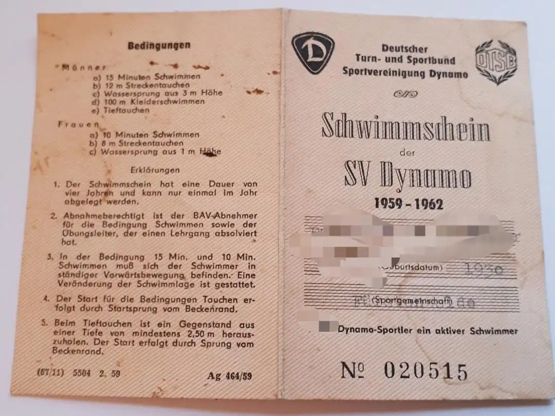 DDR Schwimmschein der SV Dynamo 1959 bis 1962