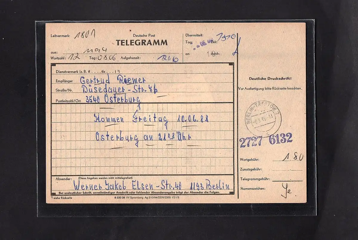DDR., Telegramm mit Me.F. Mi.-Nr. 3365