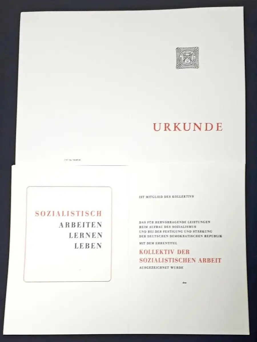 DDR Urkunde Kollektiv der sozialistischen Arbeit blanko