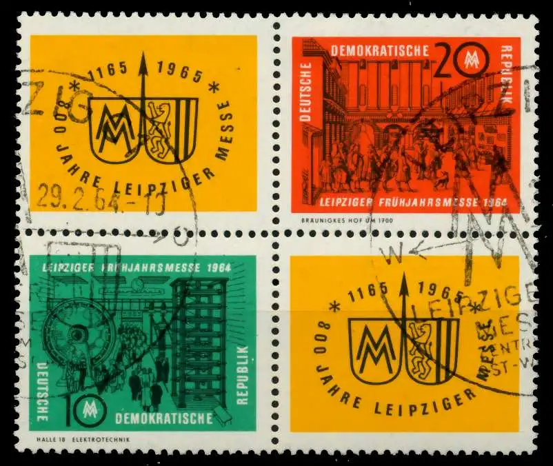Ausgabe Leipziger Frühjahrsmesse 1964 im Viererblock mit zwei Zierfeldern ZF-20 / 10-ZF, waagrecht versetzter Block (MichelNr.: 1012, 1013)