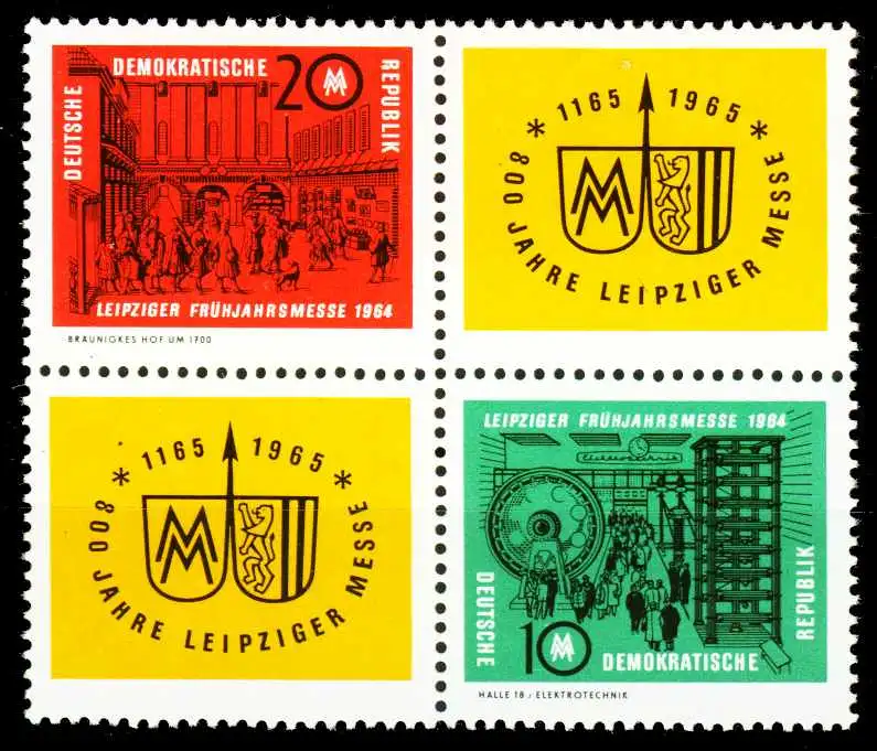 Ausgabe Leipziger Frühjahrsmesse 1964 im Viererblock mit zwei Zierfeldern 20-ZF / ZF-10 (MichelNr.: 1012, 1013)
