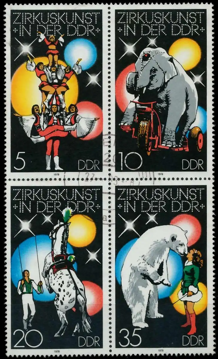5 + 10 + 20 + 35 Wert aus der Ausgabe Zirkuskunst in der DDR Zusammendruck Viererblock (MichelNr.: 2364, 2365, 2366, 2367)