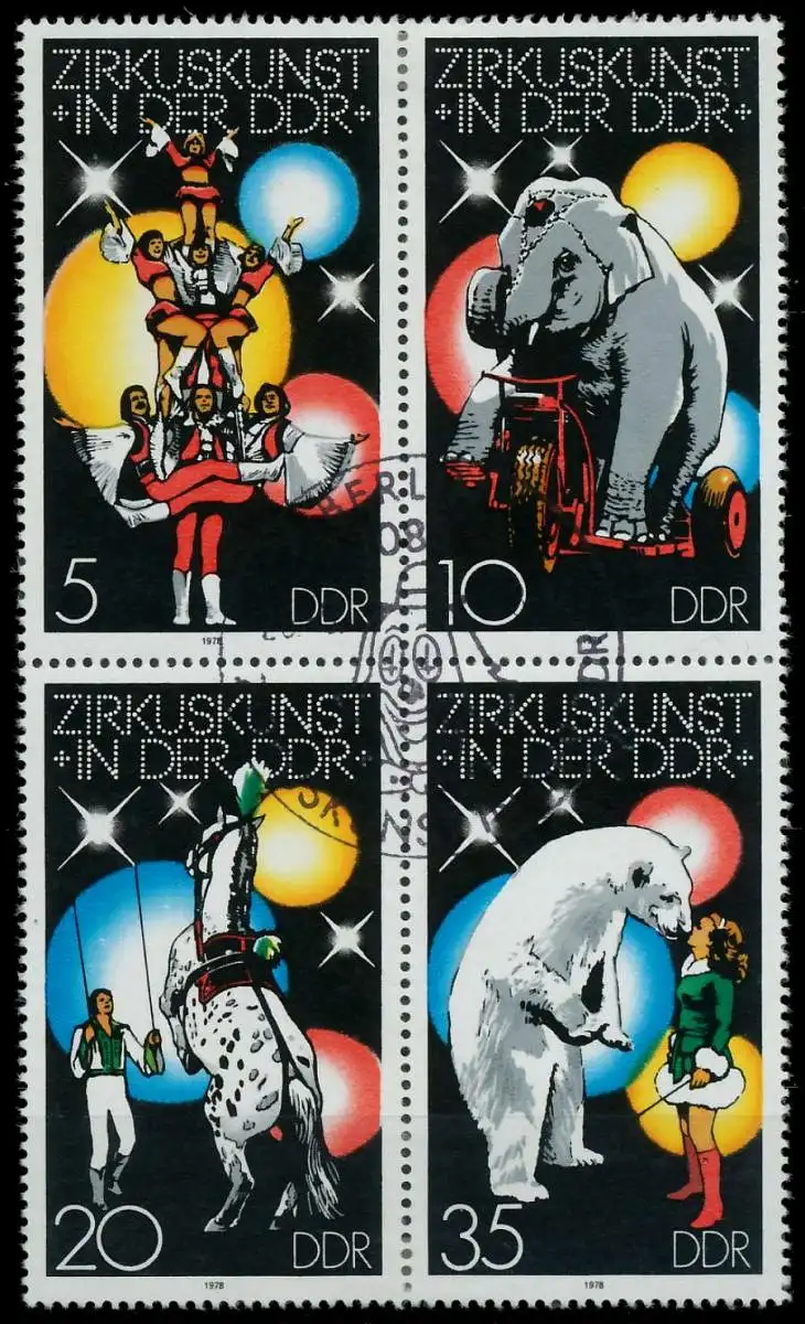 5 + 10 + 20 + 35 Wert aus der Ausgabe Zirkuskunst in der DDR Zusammendruck Viererblock (MichelNr.: 2364, 2365, 2366, 2367)