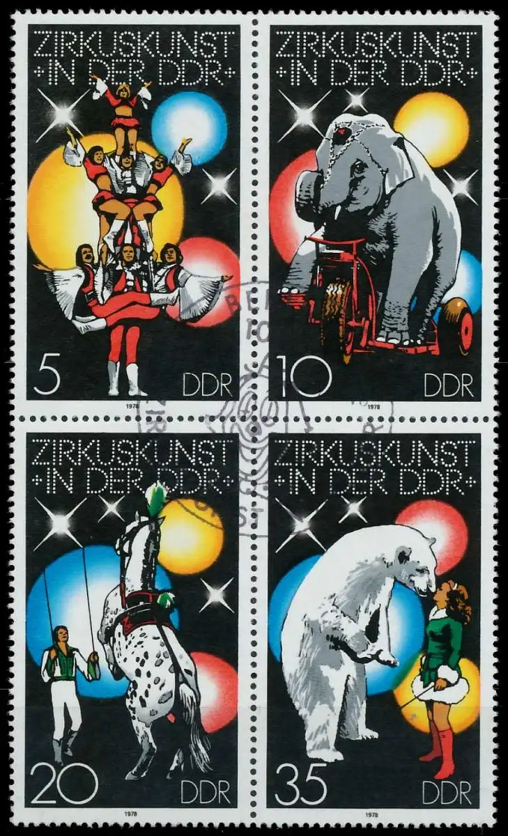 5 + 10 + 20 + 35 Wert aus der Ausgabe Zirkuskunst in der DDR Zusammendruck Viererblock (MichelNr.: 2364, 2365, 2366, 2367)