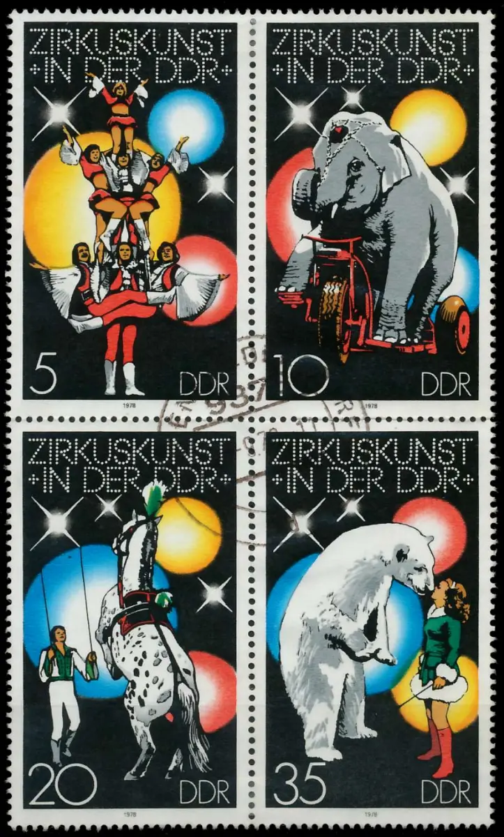 5 + 10 + 20 + 35 Wert aus der Ausgabe Zirkuskunst in der DDR Zusammendruck Viererblock (MichelNr.: 2364, 2365, 2366, 2367)