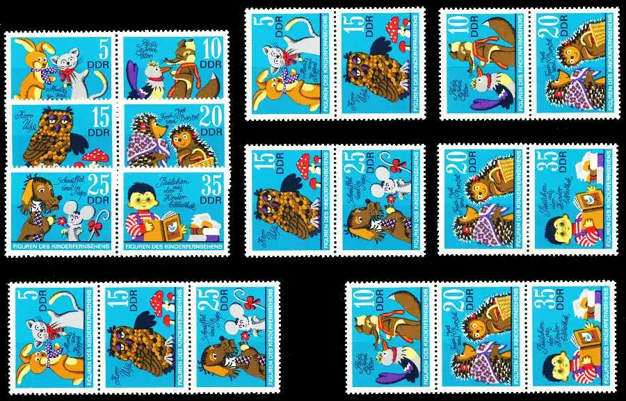 9 Zusammendruckausgaben aus der Kleinbogenausgabe Figuren des Kinderfernsehens (MichelNr.: 1807, 1808, 1809, 1810, 1811, 1812)