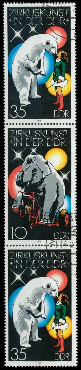 35 + 10 + 35 Wert aus der Ausgabe Zirkuskunst in der DDR Zusammendruck (MichelNr.: 167, 2365, 2367)
