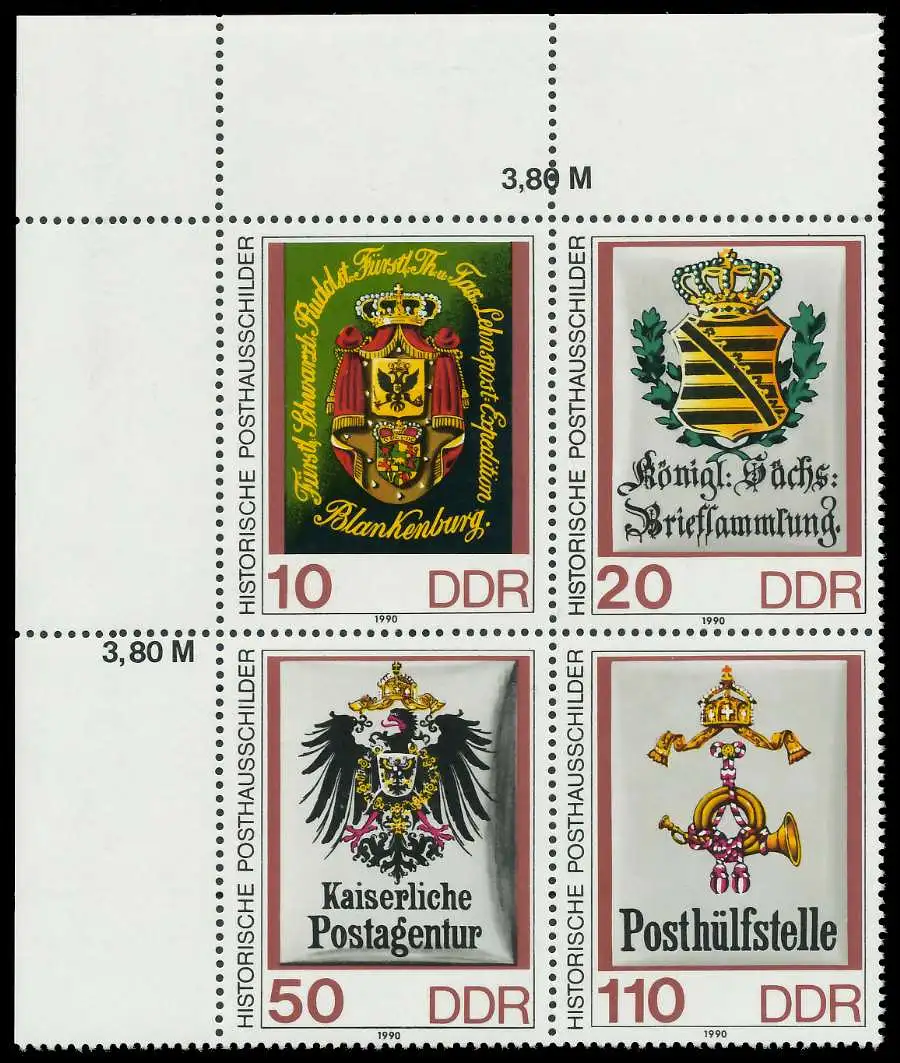 Ausgabe Tag der Werktätigen des Post- und Fernmeldewesens - Historische Posthausschilder - Großformat, Zusammendruck 4er Block (MichelNr.: 3306, 3307, 3308, 3309)