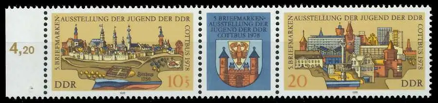 10 + ZF + 20 Ausgabe Briefmarkenausstellung der Jugend in Cottbus Dreierstreifen (MichelNr.: 371, 2343, 4344)