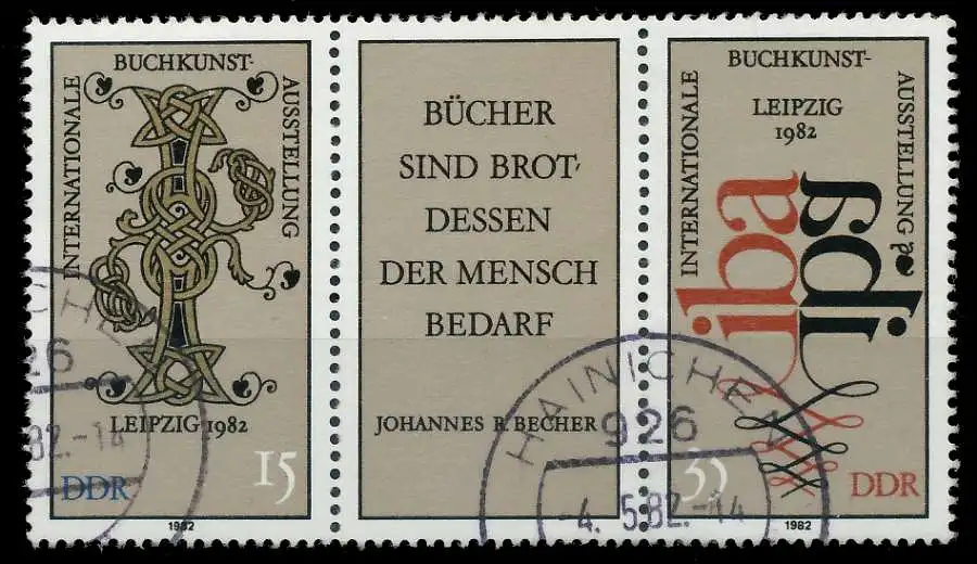 15 + ZF + 35 Wert aus der Ausgabe Internationale Buchkunstausstellung in Leipzig, Dreierstreifen (MichelNr.: 529, 2697, 2698)