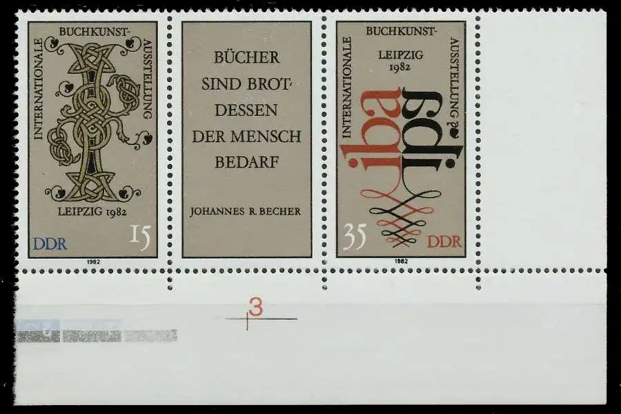 15 + ZF + 35 Wert aus der Ausgabe Internationale Buchkunstausstellung in Leipzig, Dreierstreifen (MichelNr.: 529, 2697, 2698)