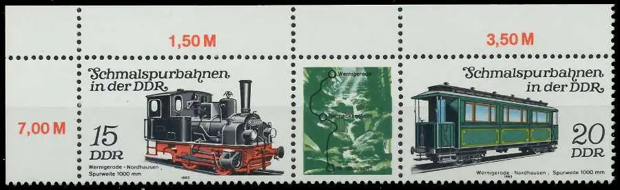 15 + ZF + 20 Zusammendruck aus der Ausgabe Schmalspurbahnen in der DDR, Dreierstreifen (MichelNr.: 557, 2792, 2793)