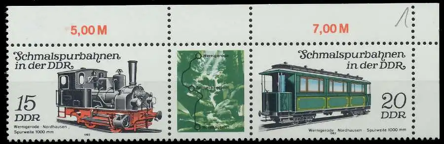 15 + ZF + 20 Zusammendruck aus der Ausgabe Schmalspurbahnen in der DDR, Dreierstreifen (MichelNr.: 557, 2792, 2793)