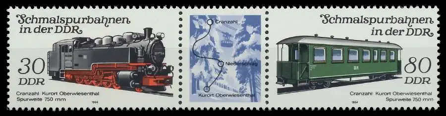 30 + ZF + 80 Zusammendruck aus der Ausgabe Schmalspurbahnen in der DDR, Dreierstreifen (MichelNr.: 577, 2864,2867)