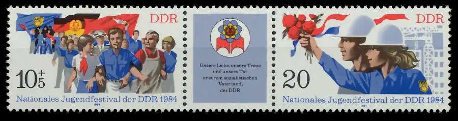 10 + ZF + 20 Zusammendruck aus der Ausgabe Nationales Jugendfestival der DDR 1984 (MichelNr.: 589, 2878, 2879)