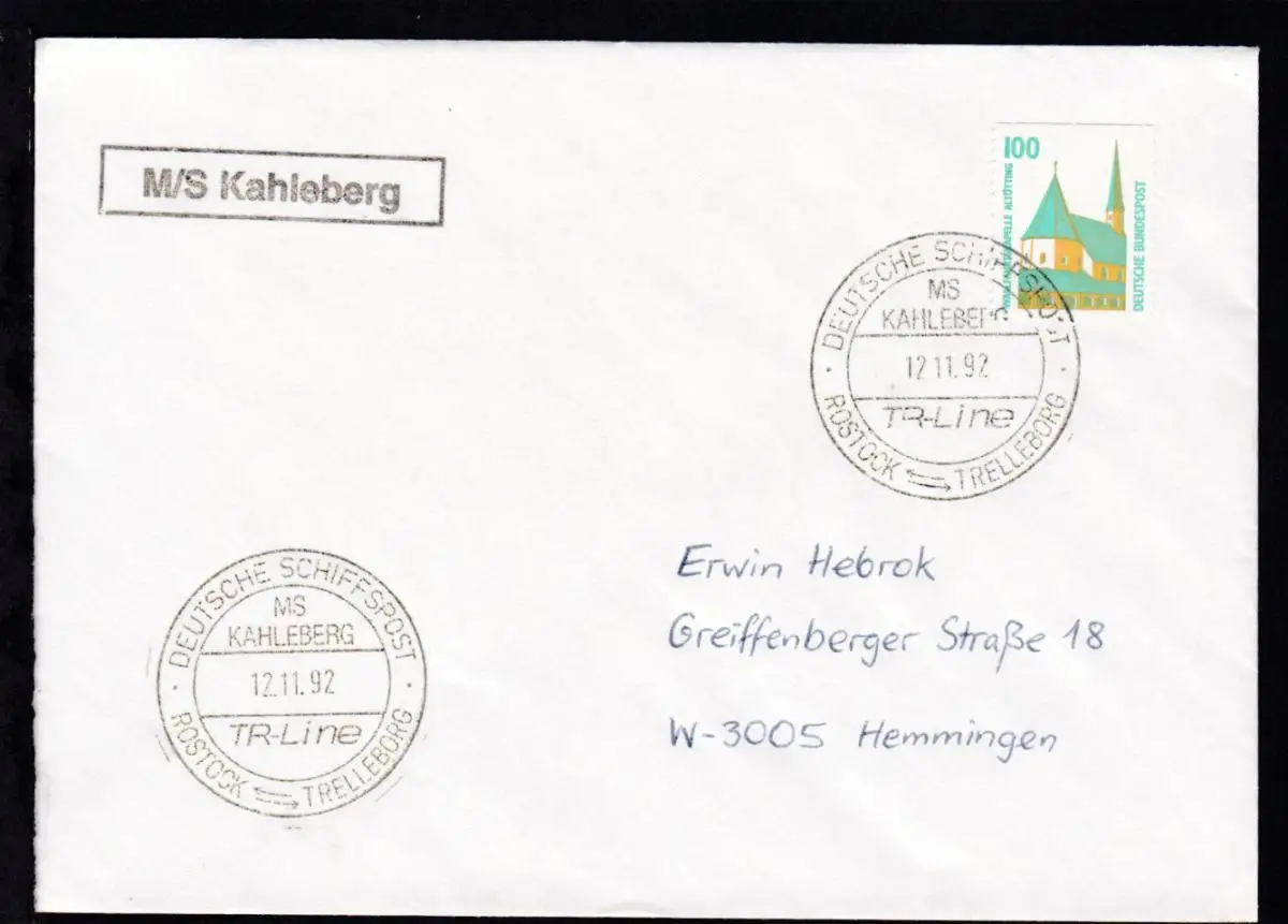 DEUTSCHE SCHIFFSPOST MS KAHLEBERG TR-Line ROSTOCK-TRELLEBORG 12.11.92 + R1