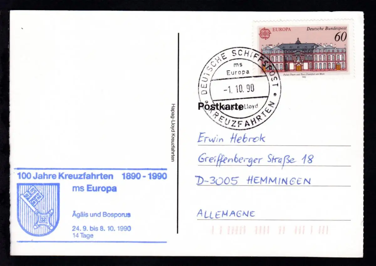 DEUTSCHE SCHIFFSPOST ms Europa hapag-Lloyd KREUZFAHRTEN 1.10.90 + Cachet