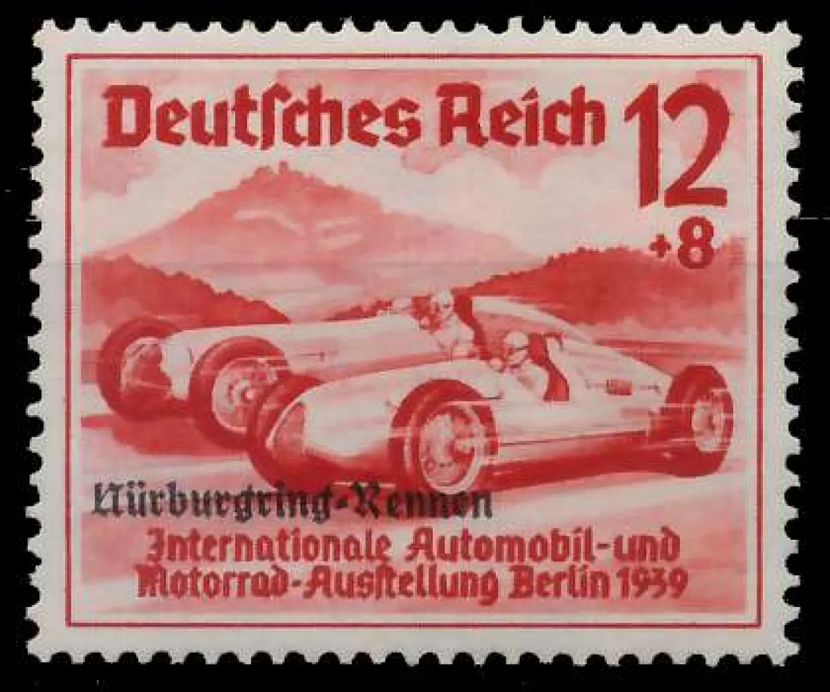 12+8 Pfg Wert aus der Ausgabe Werte der internationalen Automobil-Ausstellung 1939 in Berlin mit Aufdruck "Nürburgring-Rennen"