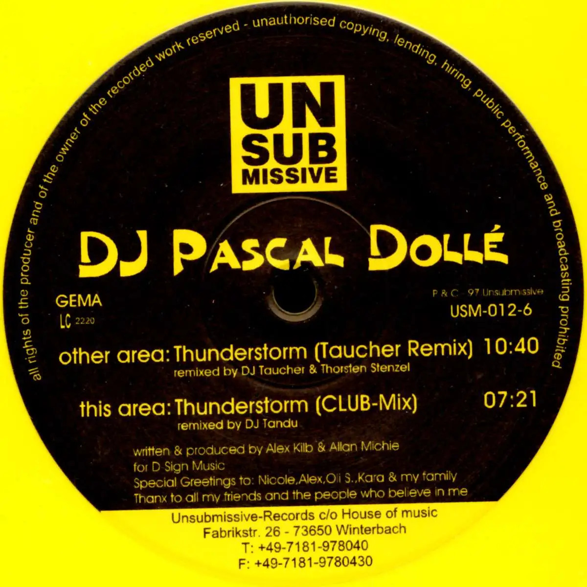 12" Maxi DJ Pascal Dollé - Thunderstorm, COL, yellow vinyl; clear sleeve w/o sticker, Zustand Platte VG+ Hülle VG+; Made in Germany 1997 Unsubmissive USM-012-6, Tracks Taucher Remix 10:40, Club Mix 7:21