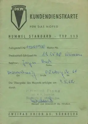 DKW Hummel Standard Typ 113 Kundendienstkarte 1962