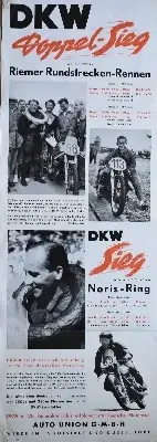 68 x 24 cm DKW Doppel-Sieg auf dem Riemer- u. Noris-Ring Aug. 1952 Leichte Gebrauchsspuren, war oben links zusammengeklebt!