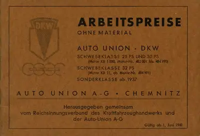 DKW Schwebeklasse Sonderklasse Arbeitspreise 1937-1941