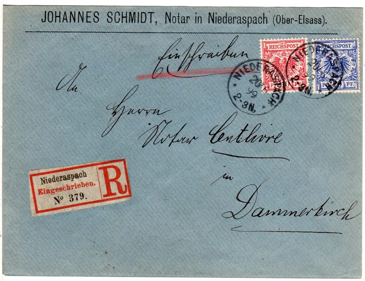 DR 1899, 10+20 Pf. auf Firmen Einschreiben Brief v. NIEDERASPACH Elsass