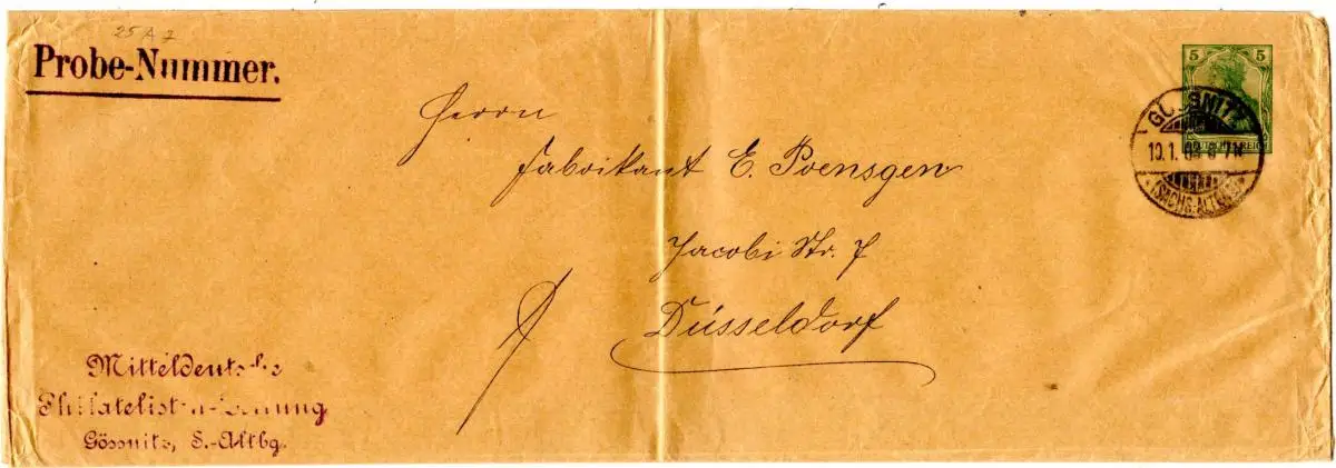Privatganzsachenumschlag (senkr. Faltung, siehe scan) Mitteldeutsche Philatelisten-Zeitung, Probe-Nummer v. Gössnitz n. Düsseldorf.