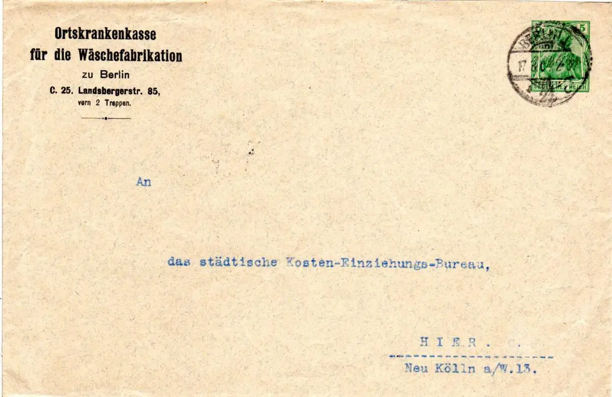 Privatganzsache Ortskrankenkasse für die Wäschefabrikation zu Berlin im ungewöhnlichen Format 196x128 mm.