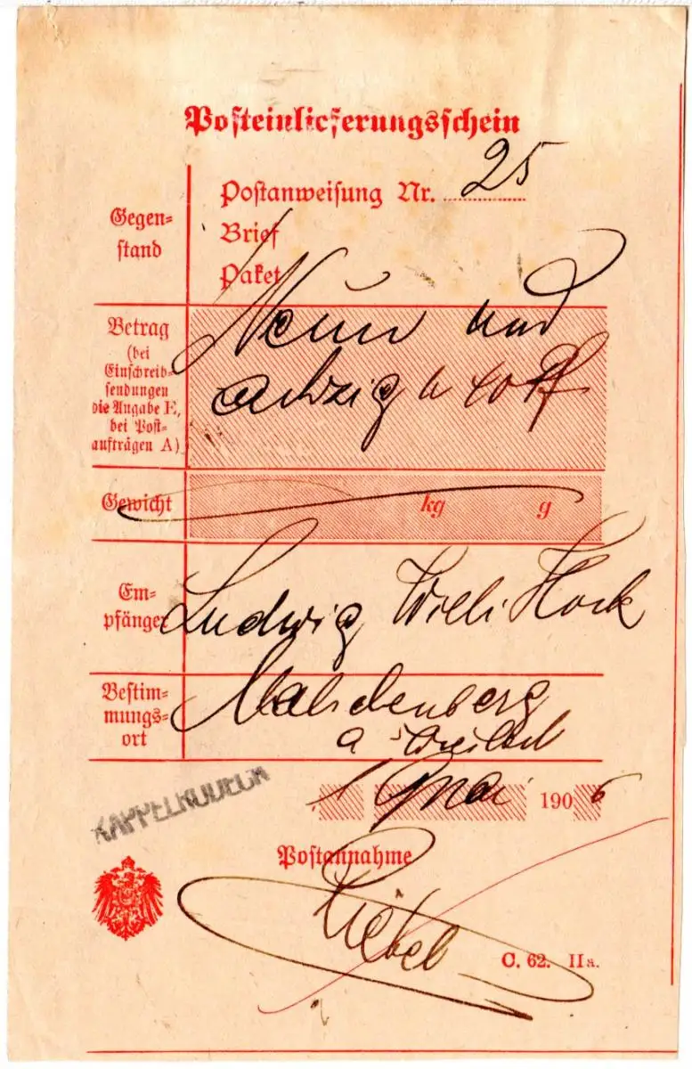 DR 1906, L1 Kappelrodeck auf Post Einlieferungsschein f. eine Postanweisung