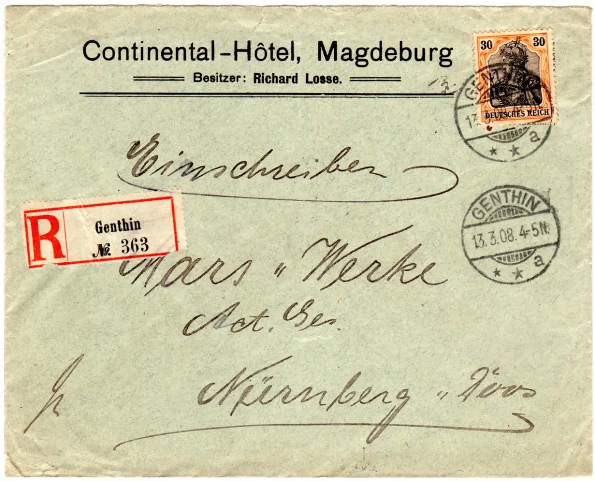 DR 1908, EF 30 Pf. Germania auf Hotel Brief v. Genthin n. Nürnberg