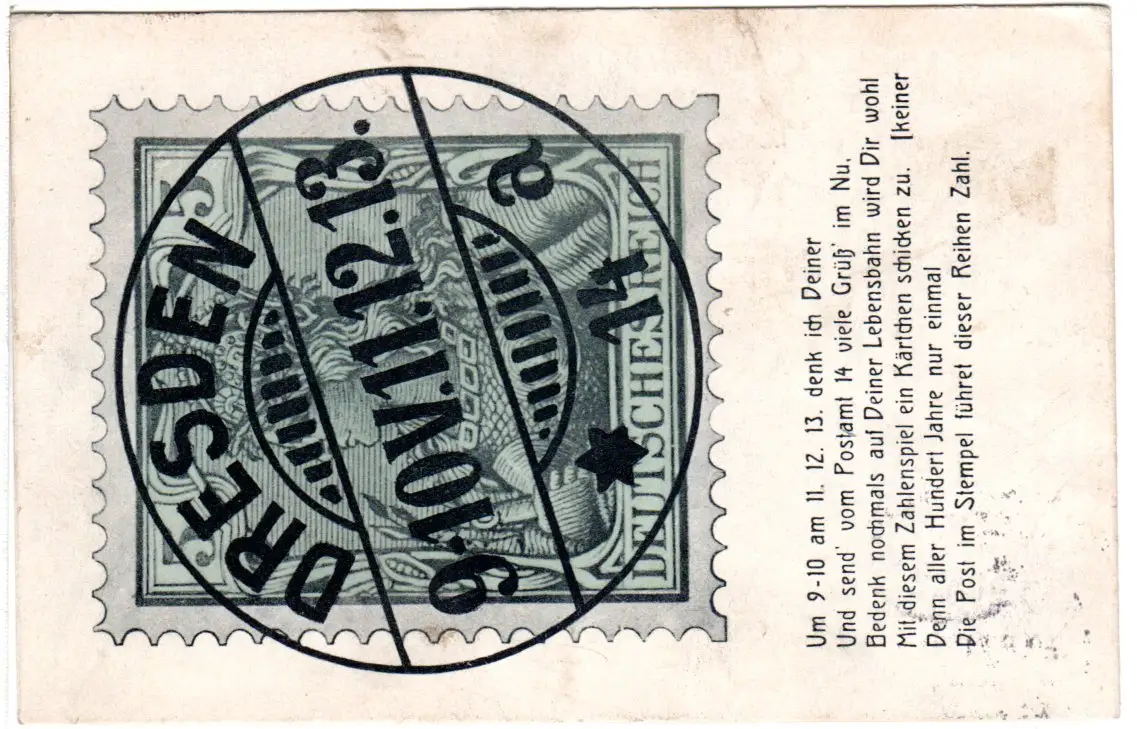 DR 1913, Dresden-Stpl. m. Datumskuriosum 11.12.13. 9-10V auf entspr. AK m. 5 Pf.