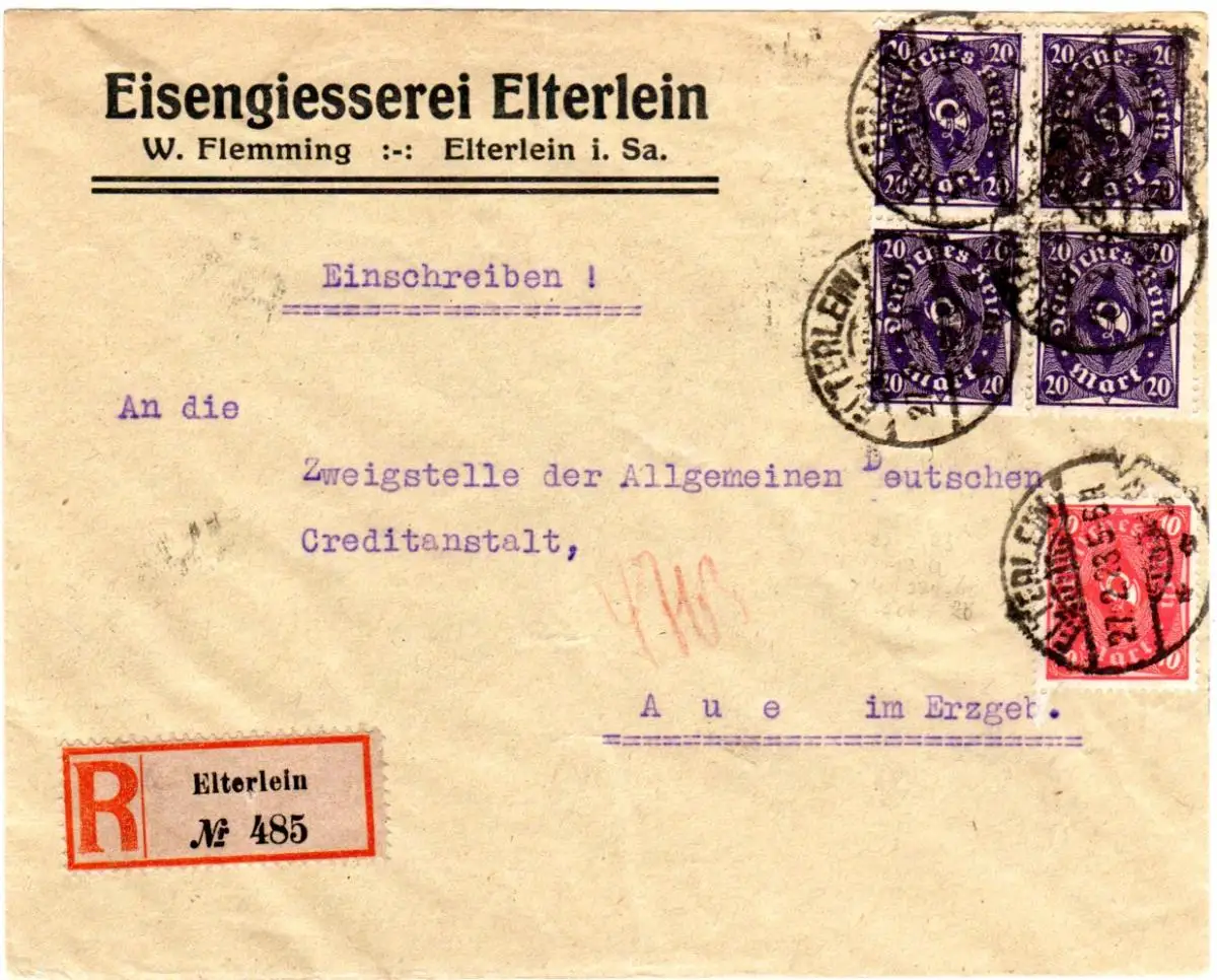 DR 1923, 10+4x20 Mk. auf Einschreiben Brief v. ELTERLEIN Eisen Gießerei