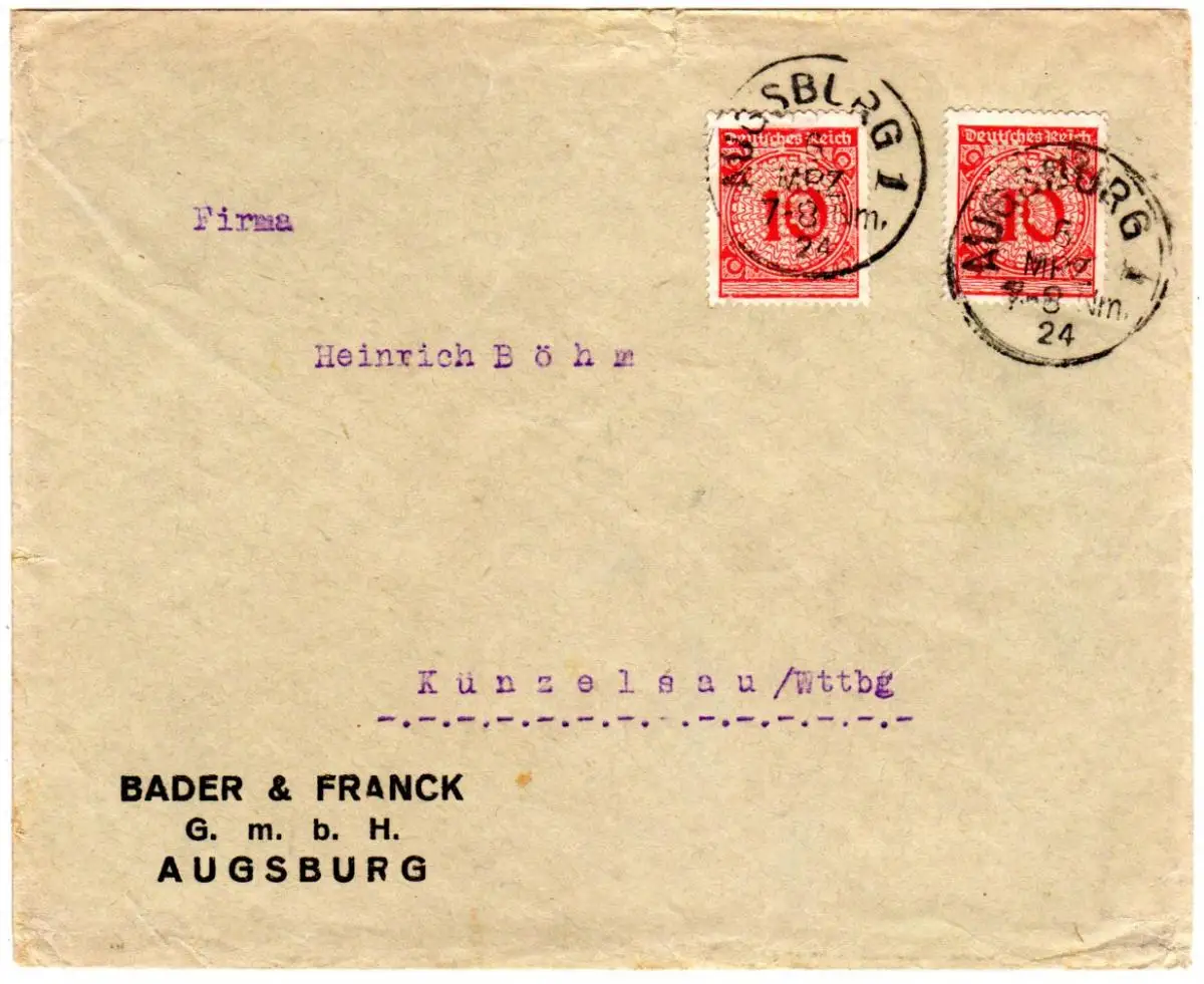 DR 1924, 2x10 Pf. m. perfin B&F auf Firmenbrief v. Augsburg