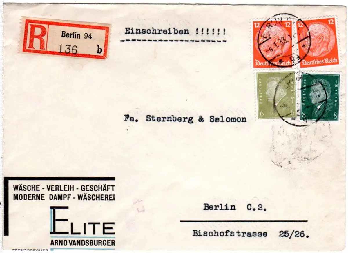 DR 1933, 6+8+2x12 Pf. auf portorichtigem Orts-Einschreiben Brief v. Berlin 94