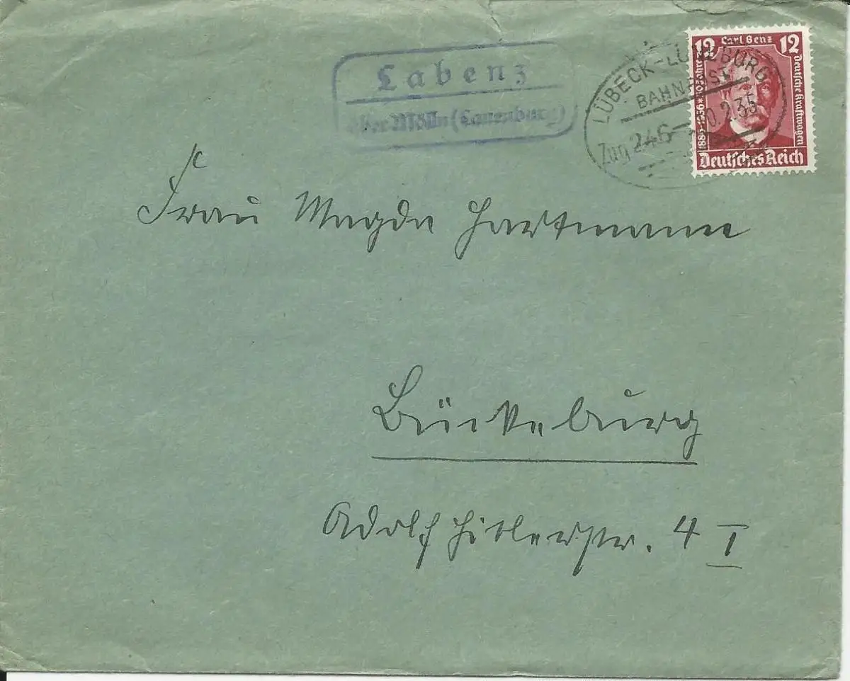 DR 1935, Brief m. Bahnpost u. Landpost Stpl. Labenz über Mölln Lauenburg. #1594