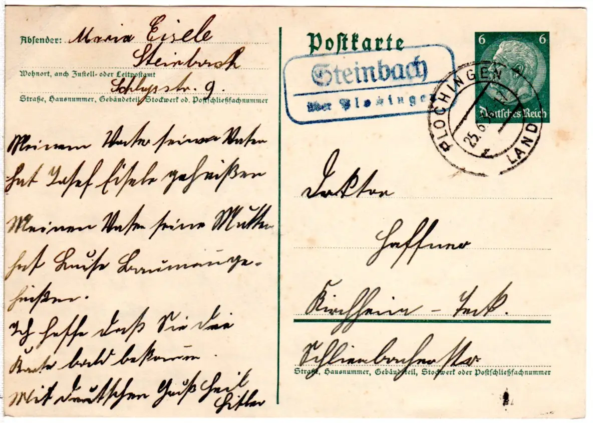 DR 1936, Landpoststpl. STEINBACH über Plochingen auf 6 Pf. Ganzsache
