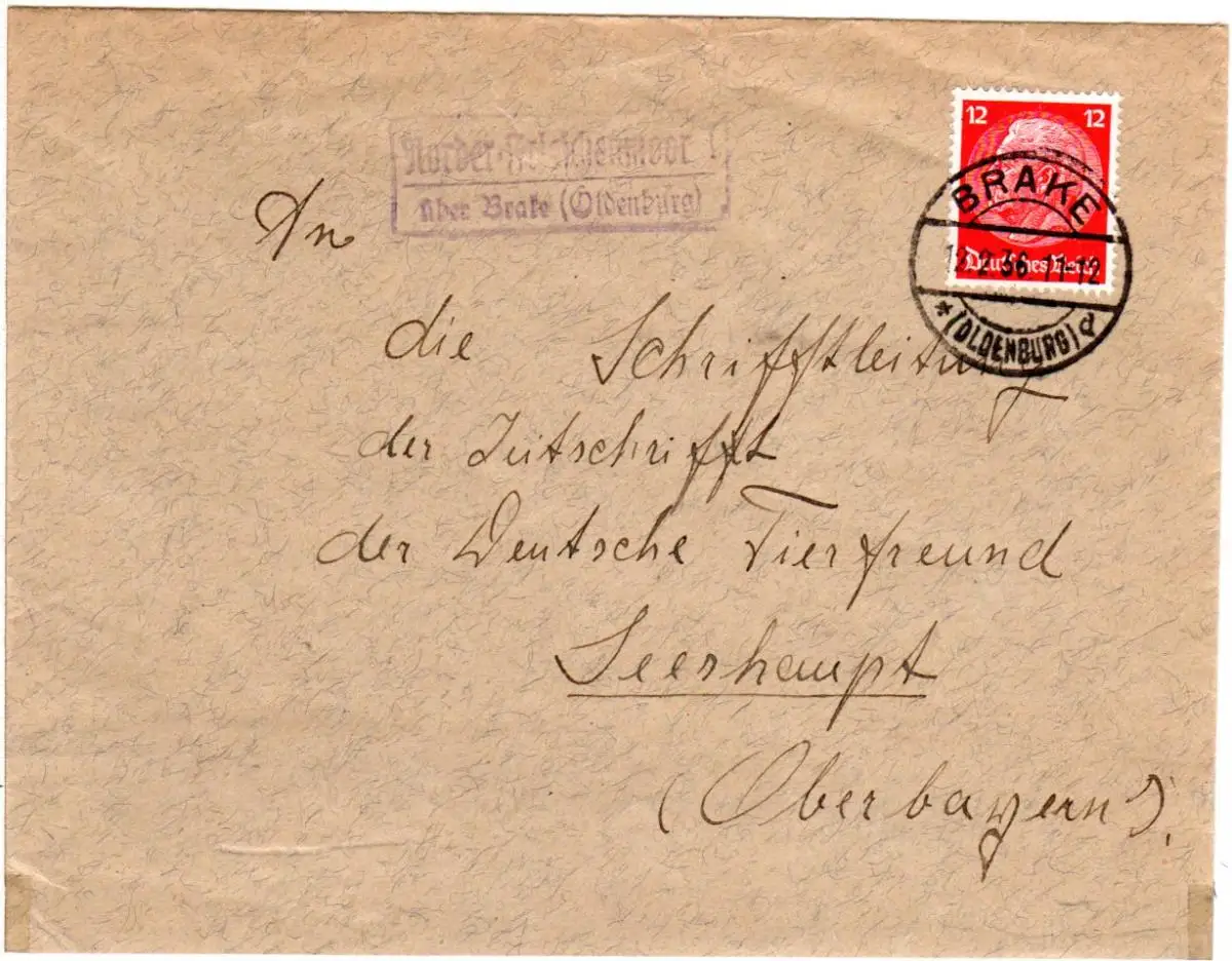 DR 1936, NORDER-FRIESCHENMOOR über Brake, Landpost Stpl. auf Brief m. 12 Pf.