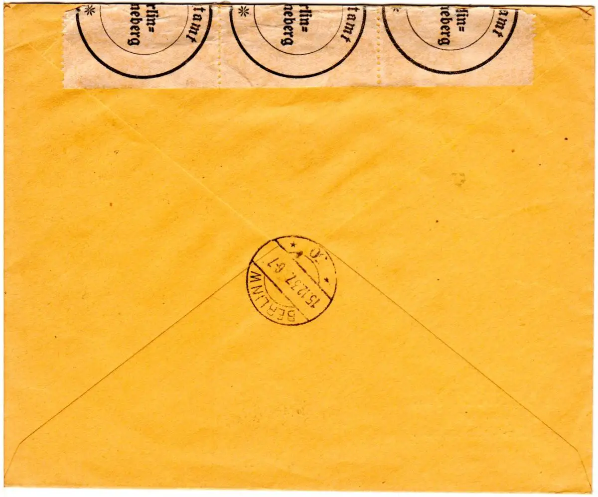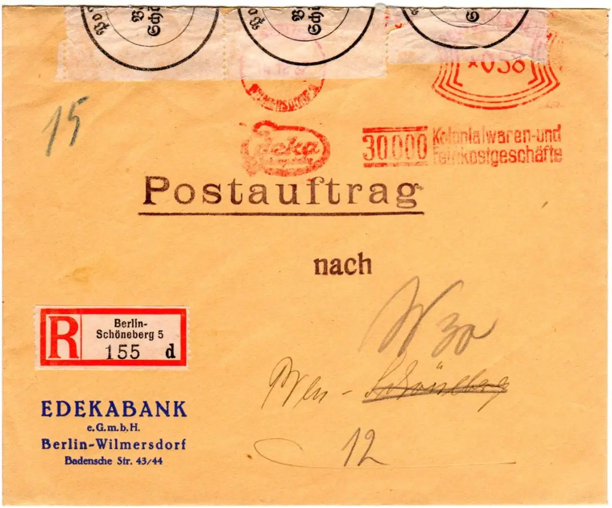 Reko Postauftrag v. Berlin Wilmersdorf n. Berlin-Schöneberg. Dort offenbar geöffnet u. nach Wiederverschluss m. offiziellen Post-Etiketten nachgesendet n. Berlin W30. Edeka Firmenumschlag m. entsprechendem Werbe-Freistempel.